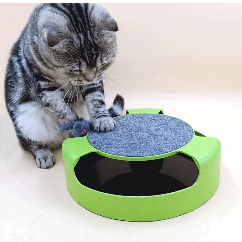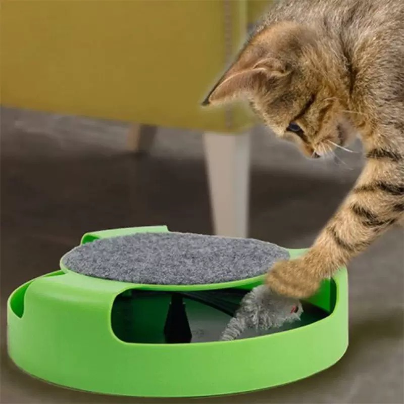 Interactive cat toy featuring a spinning mouse and felt scratch pad. A high-demand wholesale item perfect for pet shops, online resellers, and distributors offering engaging enrichment toys for cats.